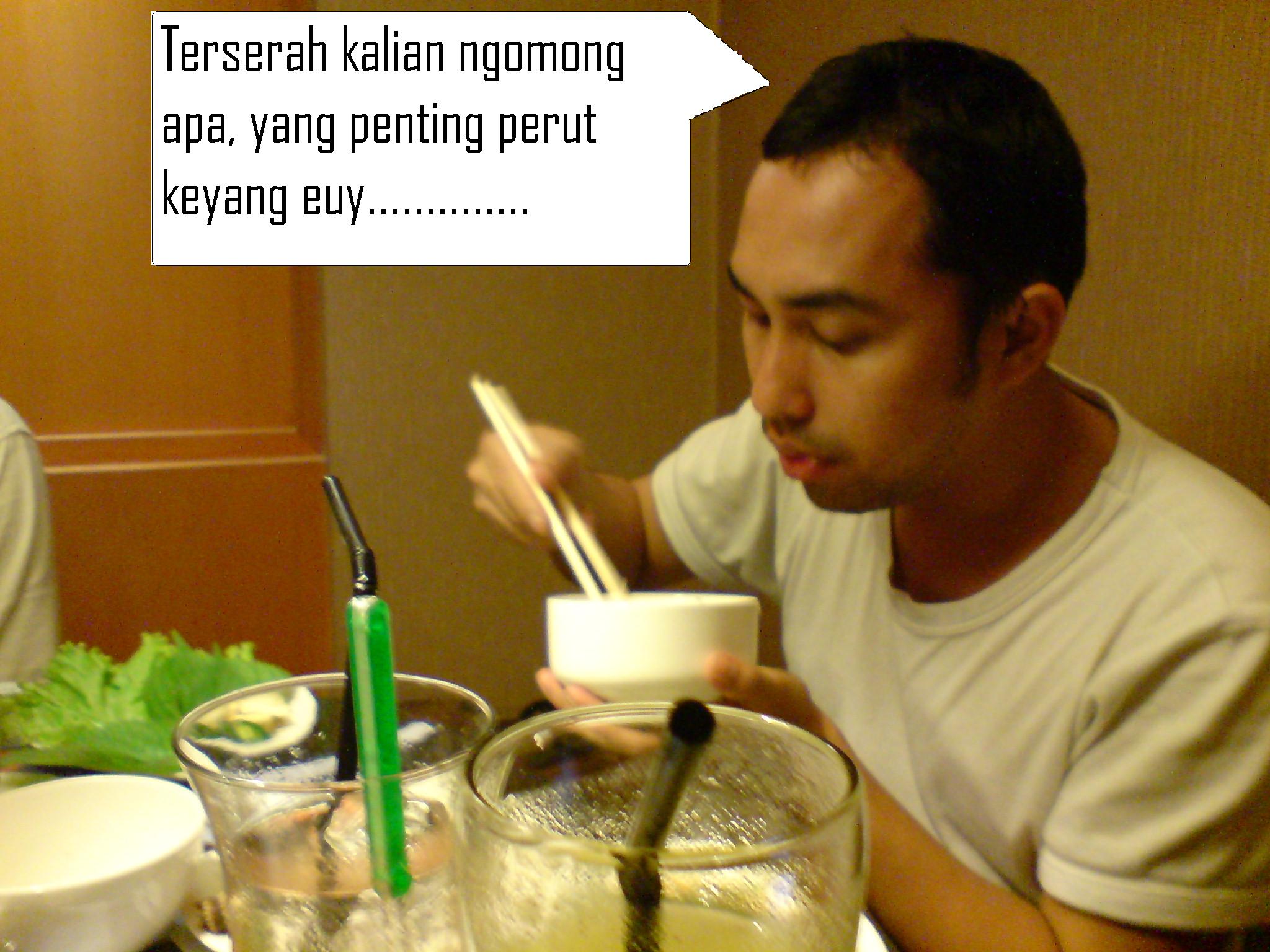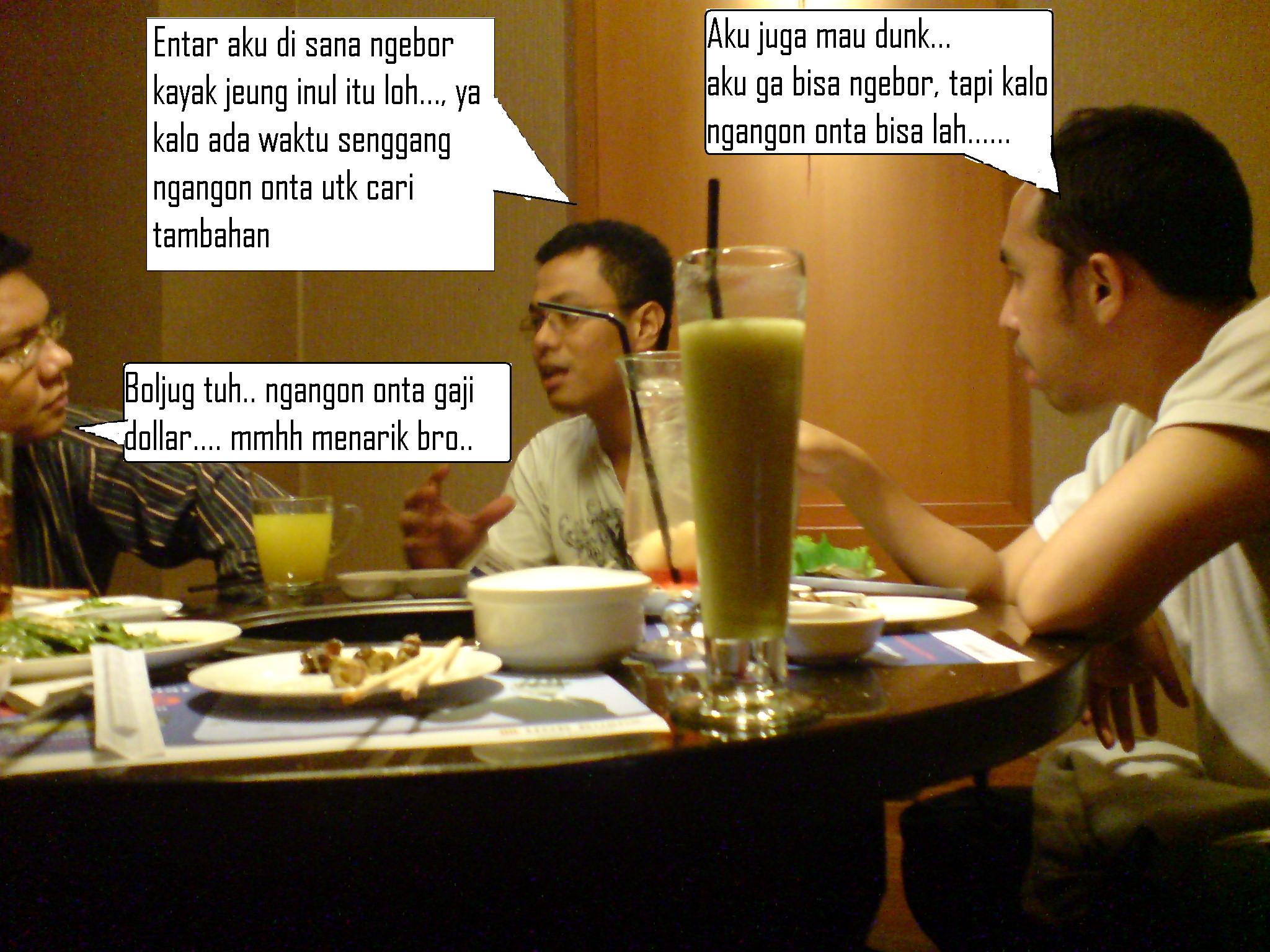 Setelah buru2 dari kantor menuju Grand indo, janjian ngumpul di Gloria Jean’s, cuma berempat Paul, Daniel, Ober, dan tentunya Indah. Paul yang terakhir nyampe… saling cerca, saling hina, olok-olokan, itu tanda kedekatan kami. Tapi cercaan kurang mantap kalo perut lapar….. cari tempat makan, pastinya aku ga mau makan di pasta de…. yang tadi siang aku dah makan di situ.